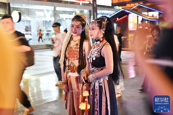 ↑5月15日,身着古装的游客在西安大唐不夜城游览拍照。新华社记者 宋为伟 摄