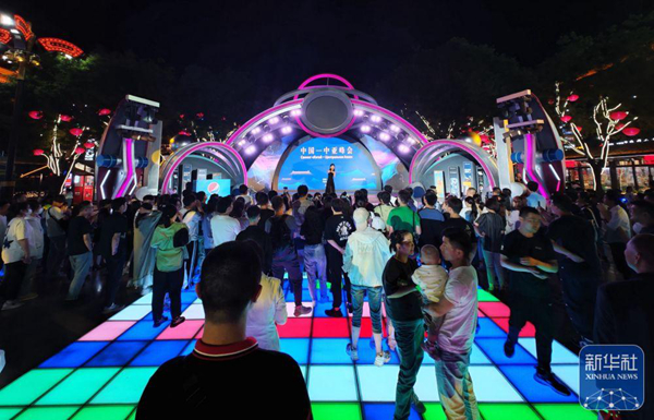 ↑5月15日,游客在西安市大唐不夜城游览。新华社记者 张博文 摄