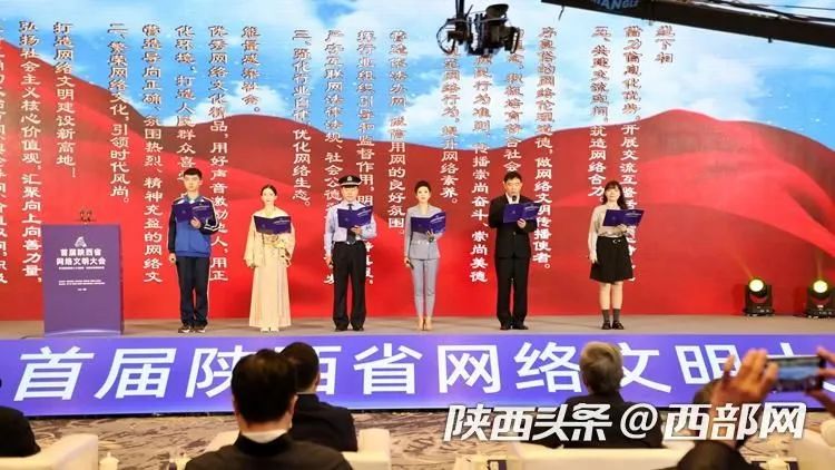 5月30日,首届陕西省网络文明大会在渭南召开。会上,陕西好青年代表、陕西省岗位学雷锋标兵李甜甜,中国好人、全国向上向善好青年韩红辉,陕西文旅推荐使者、陕西好网民冯佳晨,中国好人、陕西省道德模范曹金生,陕西好网民代表、西安电子科技大学学生王冠玉,渭南市瑞泉中学学生云汉宸等共同发布《共建网络文明倡议书》。