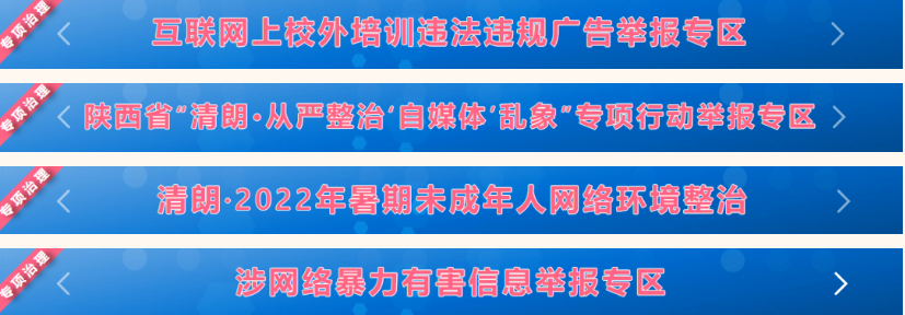 陕西省委网信办以抓好专项举报为抓手,持续开展针对网络舆情高发的关键领域专项举报,严厉整治了有关网络传播乱象。2020年8月发起“清理破坏教育环境违法违规有害信息专项整治”,针对宣传炒作“中高考状元”“学校排名”等扰乱教育教学秩序、污染网上教育环境的违法违规信息,累计处置“西工大附中家长帮”“西安中招网”“西安高考指导”等网站平台账号168个,清理违法违规帖文326篇。10月发起“清理破坏陕西房地产市场秩序违法违规有害信息专项整治”,受理处置违法违规账号76个,约谈整改房地产营销公司和传媒公司7家,清理各类违法违规帖文270余篇。2021年陆续开展“清朗·春节网络环境”专项行动、涉网上历史虚无主义、涉未成年网络环境有害信息、涉网络内容从业人员违法违规行为、校外培训违法违规广告和疫情防控网络谣言等专项举报,有力整治各类网络生态乱象。2022年组织“全省政务网站及高校网站平台账号风险隐患自查自纠专项行动”,累计排查清理风险隐患近4万个。2023年开通“清朗?从严整治‘自媒体’乱象”专项行动举报专区,聚焦社交、短视频、网络直播等类型重点平台,针对“自媒体”造谣传谣、假冒仿冒、违规营利等突出问题展开专项举报。