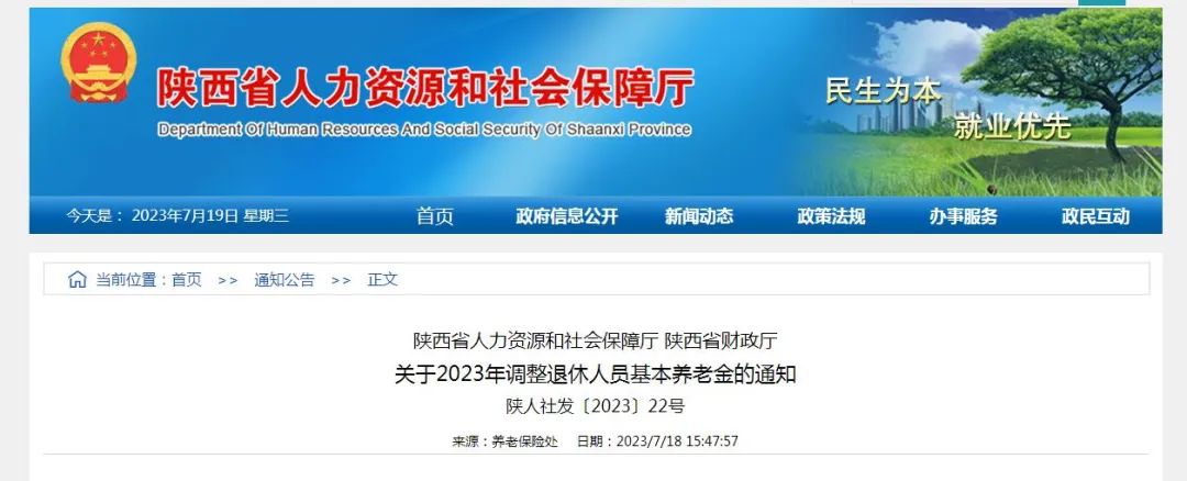 7月18日,陕西省人社厅在官网发布《关于2023年调整退休人员基本养老金的通知》(下简称《通知》),通知提到,退休人员每人每月增加40元,从2023年1月1日起执行。
