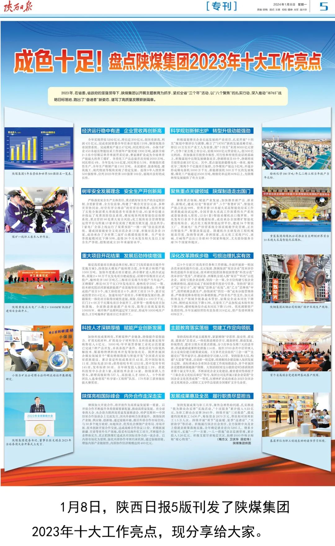 全年实现营收5292亿元,增长近200亿元,创历史新高,利润431亿元,完成省国资委全年任务计划的110%,继续领跑全省国资系统。完成煤炭产量2.47亿吨,同比增长6%。小保当矿业450米超长智能综采工作面年产量突破1300万吨,刷新全球2—3米中厚煤层单井单面开采纪录,曹家滩矿业成为全球单井产能最大的井工煤矿。各类化工产品总量首次突破2000万吨,同比增长4%。全年发电544亿度,同比增长5.5%。积极组织柔性生产,全年生产粗钢产量1161万吨。水泥建材、装备制造、建筑施工、现代物流等板块实现了稳定发展。连续9年入围世界500强榜单,位列2023年世界500强第169位,展现出良好的成长性。