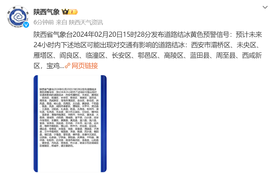 陕西省气象台2024年02月20日15时28分发布道路结冰黄色预警信号,预计未来24小时内下述地区可能出现对交通有影响的道路结冰:
