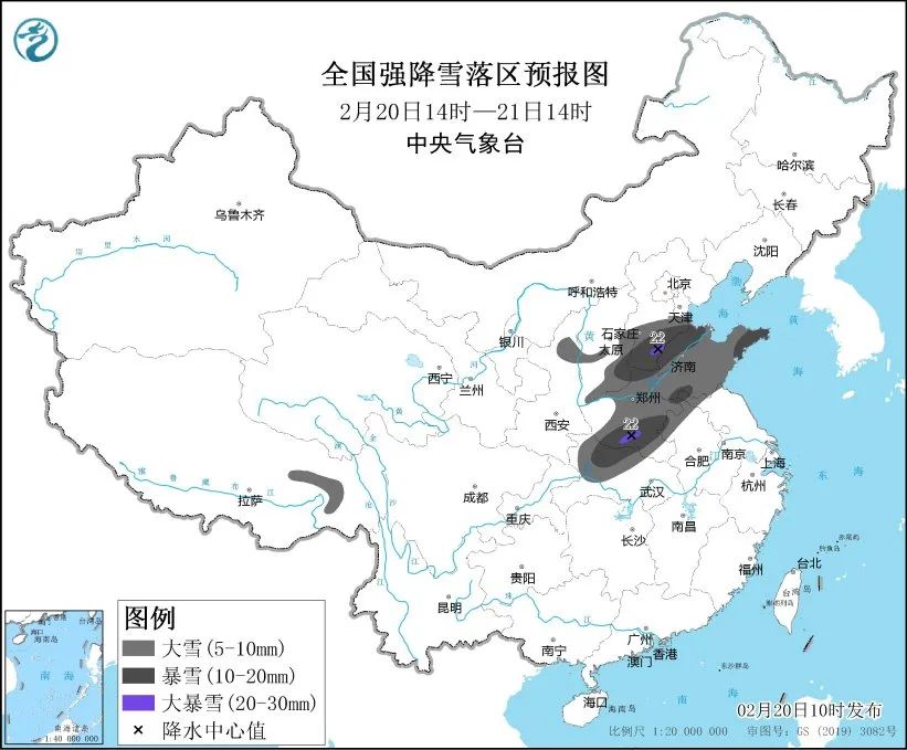 20日至22日,中东部地区将出现大范围雨雪天气。预计2月20日14时至2月21日14时,陕西北部、山西东南部、河北南部、山东、河南、安徽北部、湖北西部、西藏东部等地部分地区有大到暴雪,其中,河北南部、河南南部等地局地有大暴雪(20~22毫米)。上述部分地区新增积雪深度3~8厘米,局地可达12厘米以上。