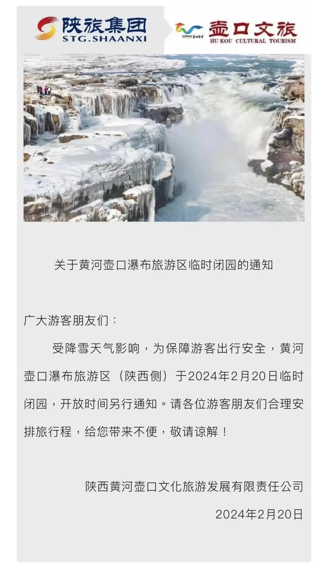黄河壶口瀑布旅游区临时闭园:受降雪天气影响,为保障游客出行安全,黄河壶口瀑布旅游区(陕西侧)于2024年2月20日临时闭园,开放时间另行通知。请各位游客朋友们合理安排旅行程,给您带来不便,敬请谅解!