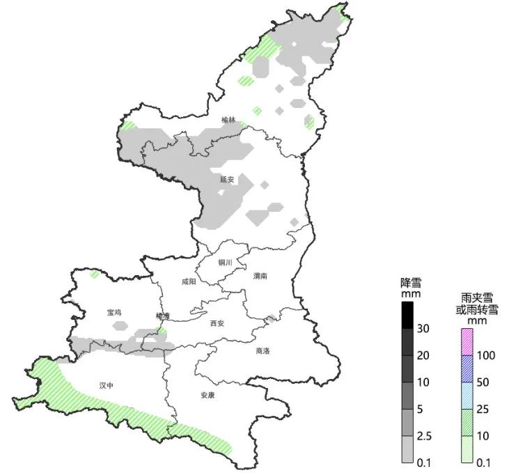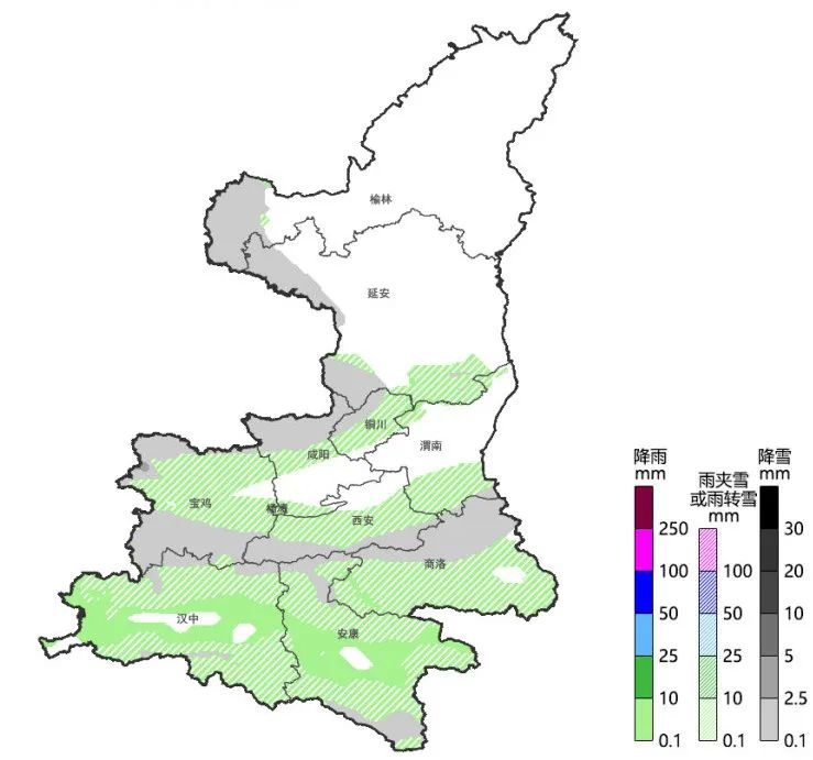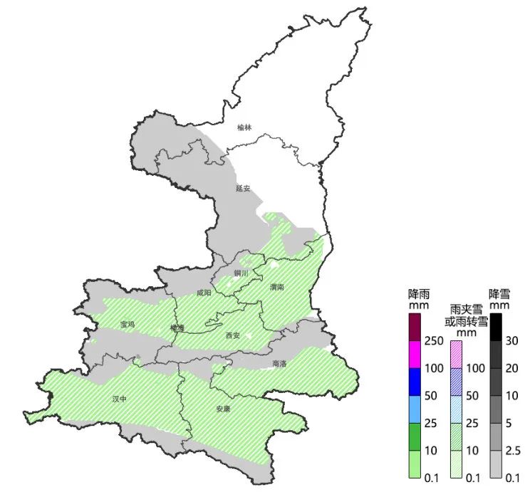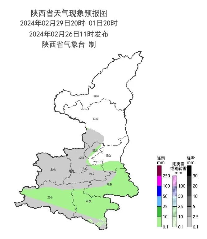 02月27日20时-02月28日20时:全省阴天,陕北西部局地、关中北部、商洛部分地方及秦巴山区有小雪或雨夹雪(0.1-2.0mm);汉中、安康部分地方有小雨或雨夹雪(0.1-1.0mm)。