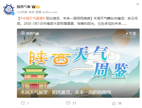 03月01日:全省阴天转多云,关中部分地方、陕南大部地方有小雪或雨夹雪。
