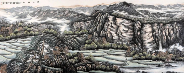 基于这样的思考,一幅溪山作品的构图在脑海渐渐形成,它将是一幅以绿色为基调的青山绿水图画,是人与自然和谐共生的美丽情愫。全画由近、中、远三部分构成,以平视和仰视的角度分别体现。近景画出几块巨大嶙峋的山石,配以年轮久远的古松和新植的翠松。背后是暮春的梯田、村落,小河边有洗衣的妇女和在田间劳作的人们。这些符号结合在一起,所要表现的就是时空久远与现实的延伸,人与自然依然和谐共生共荣,增加现代生活气息;中景突出巨碑式的丹霞层岩,岩上飞流而下的飞瀑,表现溪山的巍峨与壮观,这是全画中必须用心刻画的细节。溪山的厚重、峻峭,都要通过有力的线条表现出来,增强溪山的气势和伟岸,但又要注意不能给人以压抑感,要以云遮雾掩显现它的神奇和神秘;远景是大山背后的远山层峦,分三层渐次叠加。最上一层是春晖映照的暖色远山,对整个的冷色基调形成对比和映衬,使画面不至于过于沉郁。总之,我要表现的是春色之中磅礴而壮丽的溪山。