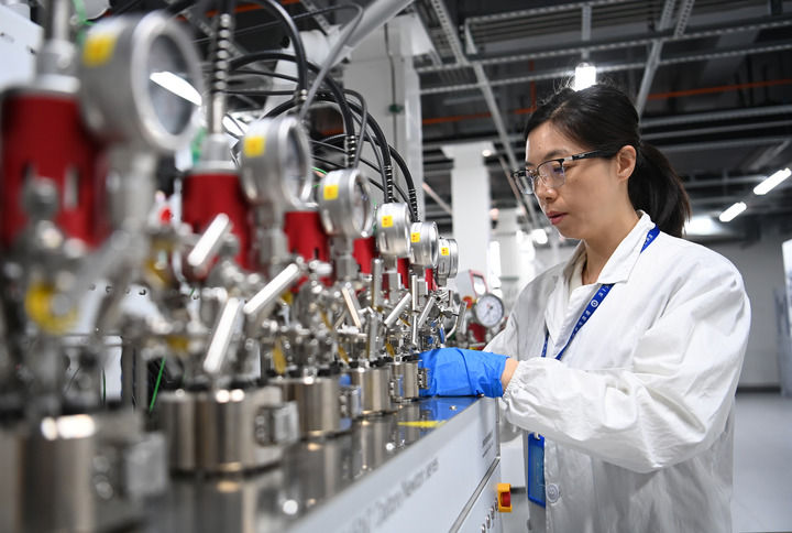 工作人员在榆林中科洁净能源创新研究院工艺放大平台实验室制备催化剂小试样品(2024年3月6日摄)。新华社记者 邹竞一 摄