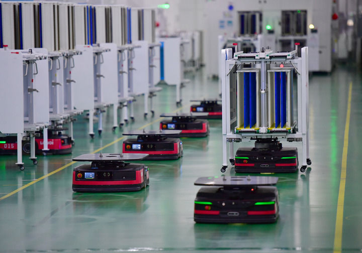 智能搬运机器人在隆基单晶硅太阳能电池工厂内工作(2024年3月6日摄)。新华社记者 邵瑞 摄