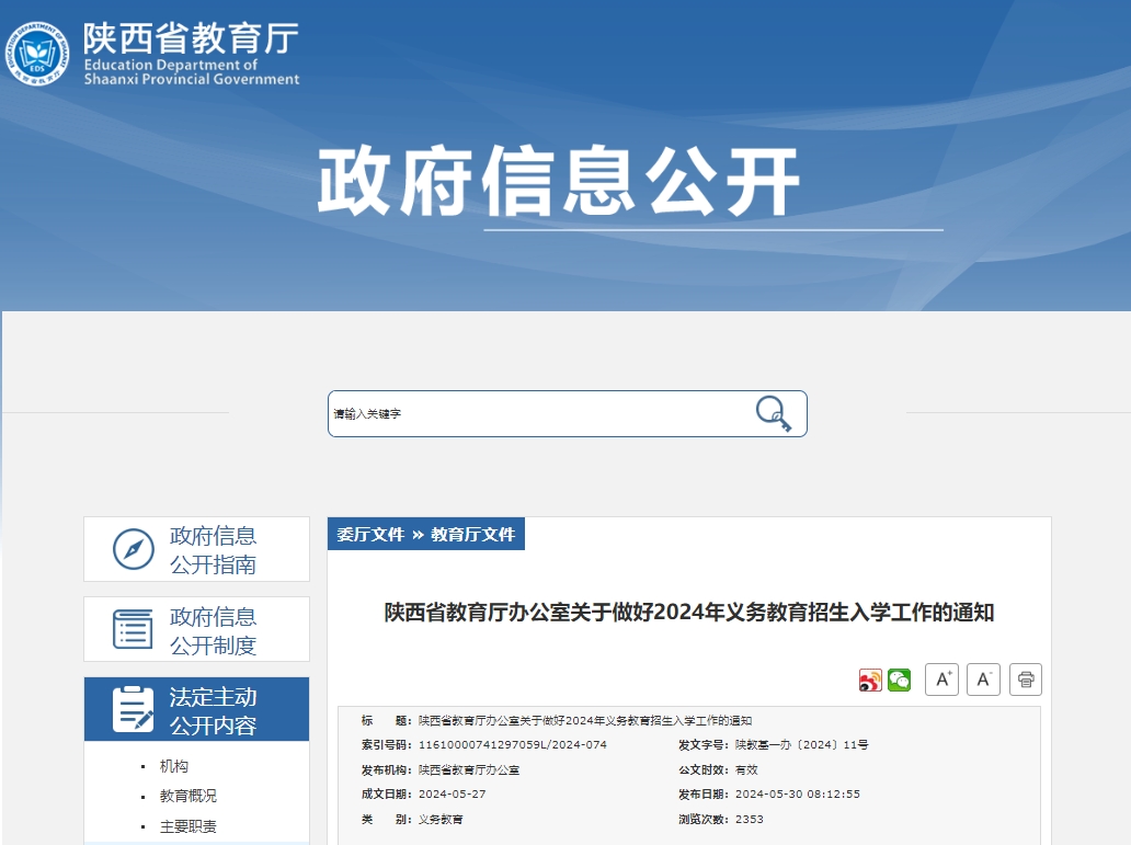 陕西省教育厅办公室关于做好2024年义务教育招生入学工作的通知
