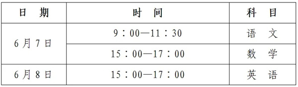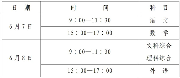 高考统考文史、艺术(文)类考试科目为语文、数学(文)、文科综合、外语;理工、体育、艺术(理)类考试科目为语文、数学(理)、理科综合、外语。外语分为英语、俄语、日语、德语、法语、西班牙语6个语种,考生可任选其中一个语种参加考试。职教单招文化课考试科目为语文、数学、英语。