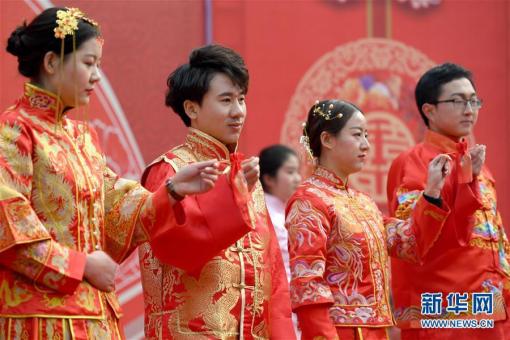 1月3日,新人们在婚礼现常 当日,中建三局西北公司的5对员工在西安曲江创意谷项目工地上举行集体婚礼。据了解,大部分新人参与了该项目的建设,他们选择用这种……