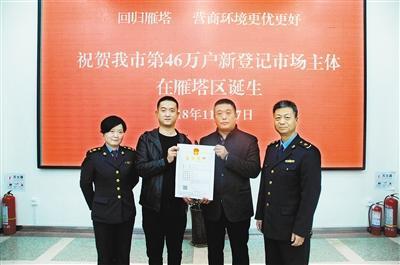 西安市工商局雁塔分局向新登记的第46万户市场主体颁发营业执照 原标题:今年西安新登记市场主体突破46万户 今年以来,西安市各级各部门深入开展“行政效能革命……