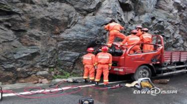 310国道落石砸中过往车辆一人被困 消防紧急救援