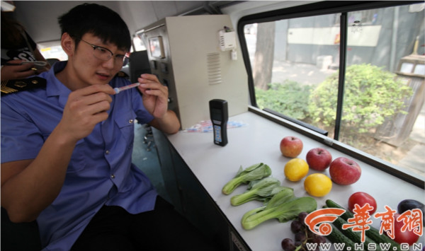 西安市雁塔区食品药品监督管理局,工作人员正在对水果表皮上的洁净度进行检测。华商报记者 黄利健 摄买来的水果直接用清水洗就可以吃了吗?哪种方式清洗水果最好……