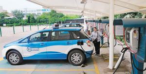 13日,在凤城二路附近一处充电站,梁师傅在为自己的新能源电动出租车充电。记者 张宇明 摄一大早从家里出门,沿着市区前行,趁着歇脚的工夫,市民驾驶的电动车便……