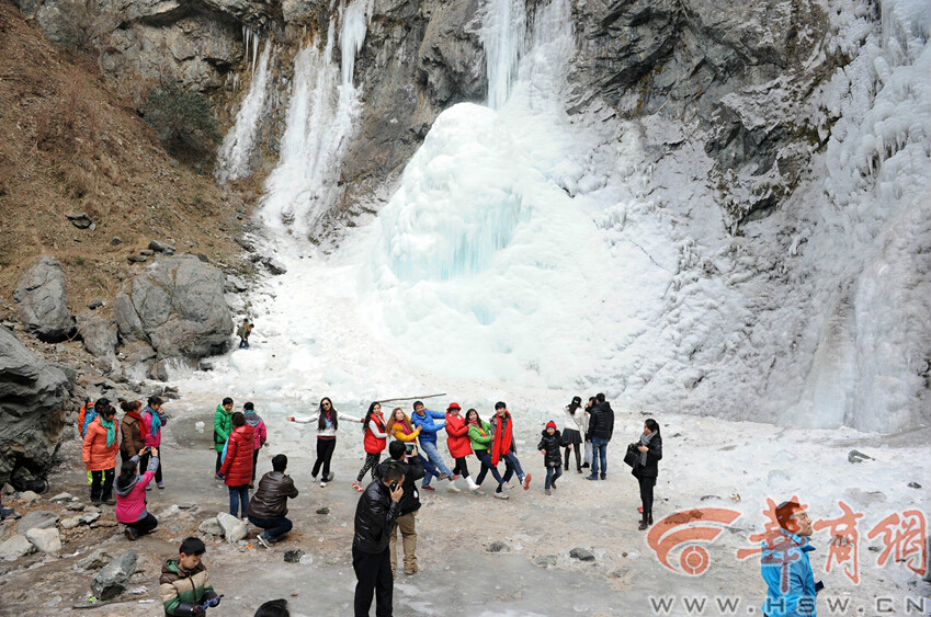 昨日下午2时,游客在户县涝峪黑山瀑布前合影留念。不时有冰块从瀑布上方掉落,着实让人捏了一把汗 记者 赵彬 摄进入冬季后,秦岭72峪开始出现冰冻瀑布的奇观,不……