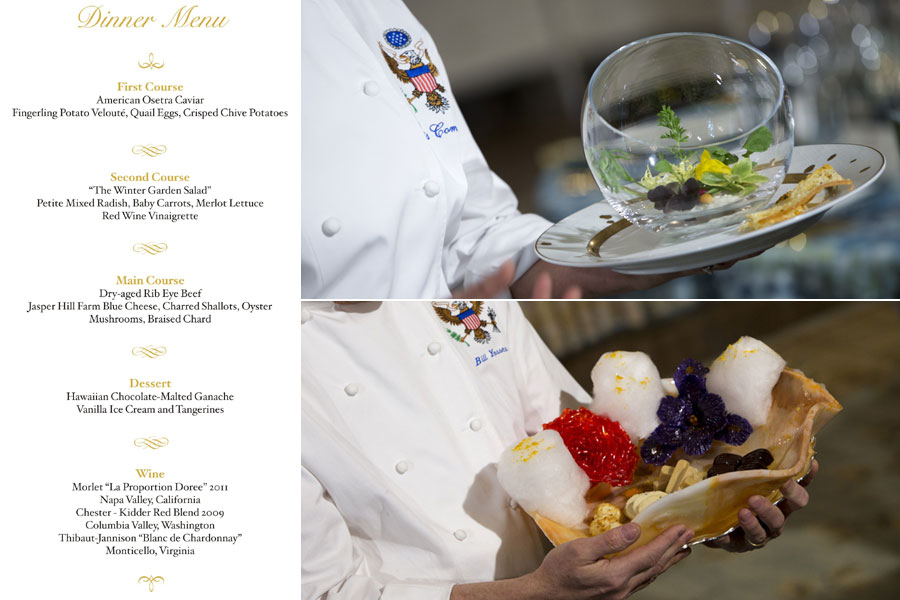 此次宴会在白宫花园举行,共有4道菜肴。第一道菜是来自美国伊利诺伊州河口的奥西特拉鱼子酱,配上来自宾夕法尼亚州的鹌鹑蛋,以及来自纽约州、爱达荷州以及加州农场的数十种马铃薯。