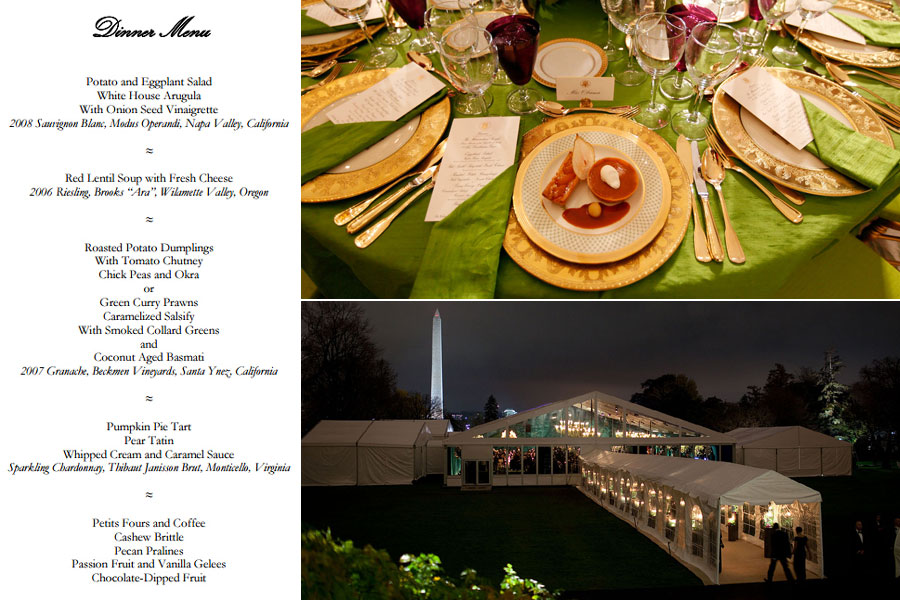 国宴的菜单是精心选定的,其中专门为素食主义者辛格准备了鲜美素食。宴会菜谱主打印度和美国时令菜肴,头道菜是土豆和茄子沙拉。甜点有南瓜馅饼、涂有生奶油和焦糖淋酱的梨挞,每道甜点都会配有不同口味的红酒。