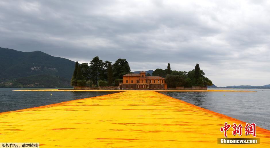 当地时间2016年6月16日,意大利伊赛奥湖,保加利亚出生的艺术家克里斯托在湖上设计出一个“漂浮的码头”。这个项目由20万块浮箱搭建成一条3公里的“桥”,通往湖心岛上。xfa安康新闻网
