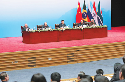 二是助力金砖国家经济发展。要顺应新一轮科技革命和产业革命潮流,敢于先行先试,为金砖国家经济发展闯出一片天地,注入新的动能。要顺应经济全球化大势,同其他国家的企业深化合作,带动新兴市场国家和发展中国家普遍发展。