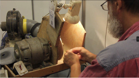 一位波兰技师正用机器磨具磨制一块琥珀原石。人民网记者 暨佩娟摄