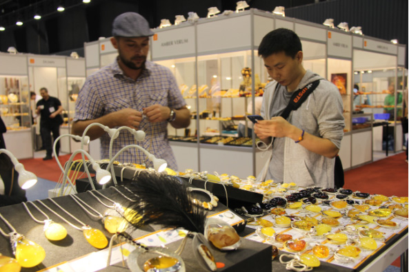 展区里,到处都能见到拿着小手电的中国买家在仔细品鉴琥珀珠宝,不少人拖着行李箱。很多中国进货商拿着手机对琥珀首饰一阵拍,只要微信那端客户点头,买卖马上成交。展会上只收现金,不少中国买家把身上所有现金花光,只能相互“拆借”,或找当地华商用人民币换欧元或兹罗提。