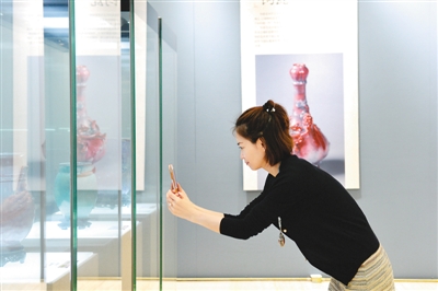 图为一位观众在拍摄国家级非物质文化遗产代表性传承人任星航的钧瓷作品。iuN安康新闻网
