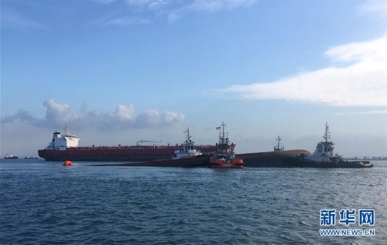 9月13日,四艘拖船将部分淹没的挖沙船转移至新加坡安乐岛附近海域,以便进行水下搜索活动。新华社发(新加坡海事及港务管理局供图)