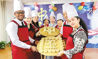 9月26日,山东省东营市东营区胜利街道胜景社区居民活动室里,山东科瑞控股集团的两名外籍员工姆吉卡(右)、阿莫德(左)和社区居民在专业糕点师指导下学习制作月饼,迎接中国国庆和中秋佳节的到来。xB2安康新闻网