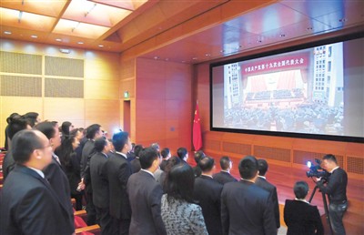 | 图为当地时间10月17日晚,中国驻美国大使馆全馆人员在馆内放映厅屏幕前观看十九大开幕式。 |