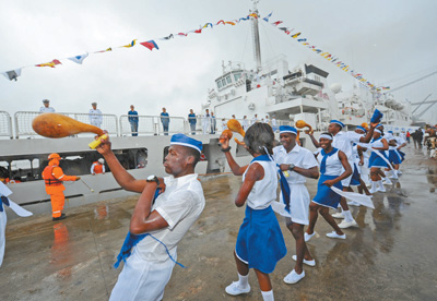 这是和平方舟医院船首次访问莫桑比克。莫方在码头举行了欢迎仪式,莫海军、国防部官员以及中国驻莫大使馆工作人员,中资机构、华侨华人代表等500余人迎接,当地民众跳起民族舞蹈表示欢迎。