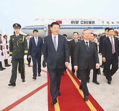 当地时间上午11时10分许,习近平乘坐的专机抵达河内内排国际机场。习近平步出舱门,越共中央政治局委员、中央书记处常务书记、中央检查委员会主任陈国旺等在舷梯旁迎接。越南青年向习近平献上鲜花。礼兵分列红地毯两侧。身着盛装的越南群众挥舞着中越两国国旗欢迎习近平。