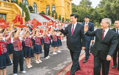| 11月12日,中共中央总书记、国家主席习近平在河内越共中央驻地同越共中央总书记阮富仲举行会谈。图为会谈前,阮富仲在主席府广场为习近平举行盛大欢迎仪式。 |