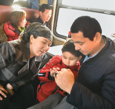 | 11月25日,在新疆塔克拉玛干沙漠西南缘的喀什-和田对开火车“和田玉龙号”上,旅客们正在休息。 |