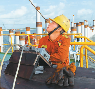 | 7月30日,在肯尼亚拉穆港,工作人员在中国交建“粤工桩11号”施工船上工作。 |