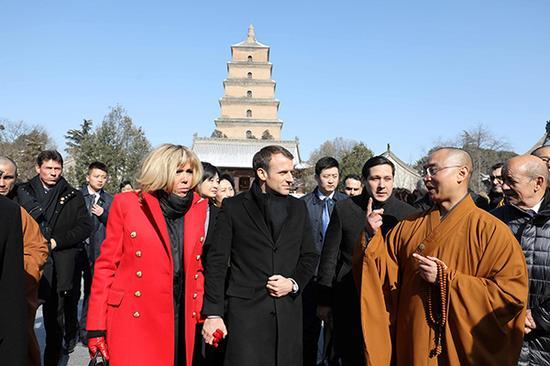 “参观完兵马俑后,马克龙总统一行赶往大雁塔。”陈晨说。中国佛教协会副会长、陕西省佛教协会会长、大慈恩寺方丈增勤法师陪同马克龙总统一行参观了大雄宝殿,并登上大雁塔;监院道宏法师为其介绍了大慈恩寺及大雁塔的历史传承和玄奘法师西行求法的精神。分析人士表示,马克龙此次选择大慈恩寺、大雁塔作为主要参观点,是因为其与“丝绸之路”的密切关系,也表明了马克龙希望传递出欧洲和中国将在“一带一路”建设的框架内加强合作的信号。