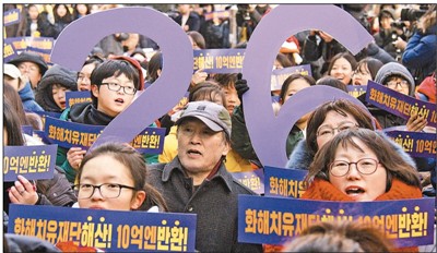 | 1月10日,韩国民众参加为解决“慰安妇”问题的第1317次“周三示威”。当天“周三示威”迎来26周年。本报记者 陈尚文摄 |