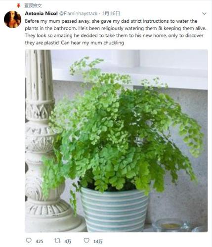 英国女消防员尼科尔近日在推特上发文写道:“家母离世前曾留下严格指示,要我爸爸为浴室内的植物浇水。他定期浇水灌溉,它们很漂亮,他搬家时决定一起带走,却发现它们是塑料的!我彷佛听到妈妈正在咯咯地笑。”