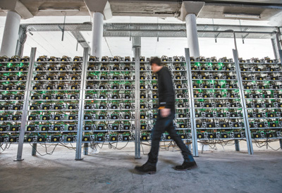 | 1月19日,奥地利伊布斯河畔魏德霍芬附近,一名“矿工”从加密币“采矿”机组前经过。人民视觉 |