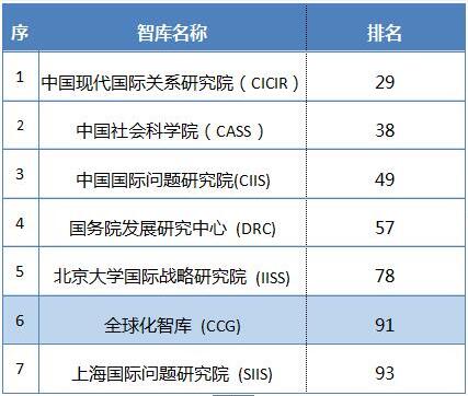 中国现代国际关系研究院、中国社会科学院等七个中国智库上榜,其中,CCG上榜2017年全球顶级智库百强榜单第91位,成为中国首个入选世界百强的社会智库。Jf7安康新闻网