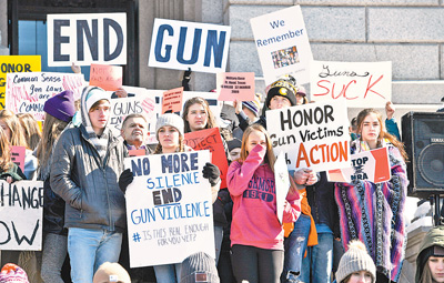 | 2月21日,在美国科罗拉多州丹佛市,众多师生和民众聚集在州议会大楼外示威,纪念佛罗里达州校园枪击案遇难者,呼吁控枪。人民视觉 |