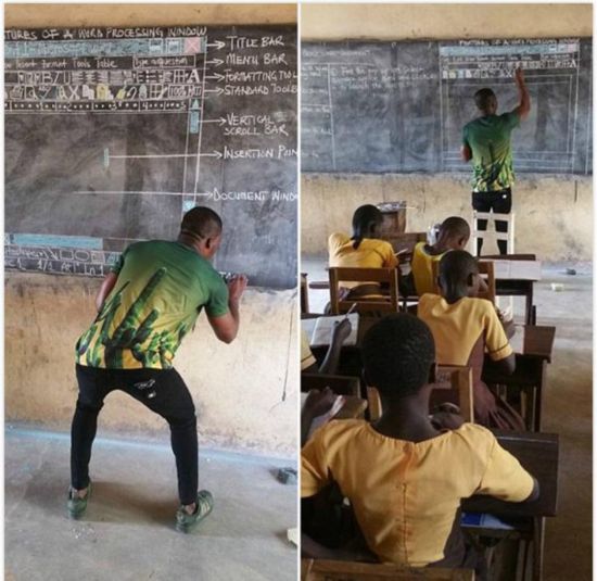 据英国《每日邮报》3月1日报道,近日,一位加纳中学老师在脸书上分享的“独门”教学照片帖子走红网络。据悉,由于他所任教的中学没有电脑设备,所以他只能使用彩色粉笔不辞辛苦地将电脑屏幕的一个个页面绘制到黑板上进行教学。他给学生在黑板上画图讲解如何使用微软Word的照片发出后,这位老师获得了全球的赞誉。