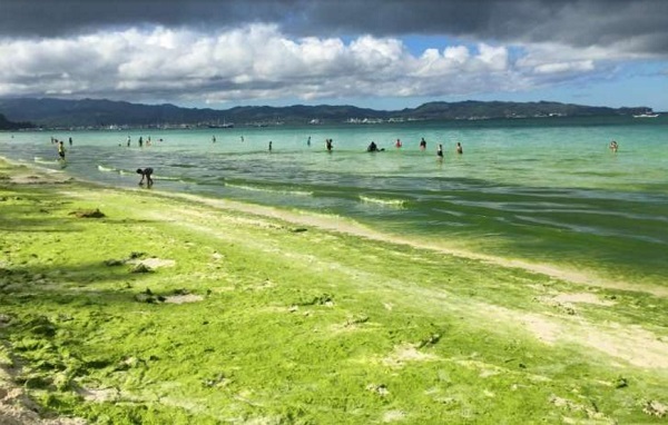长滩岛的一片白沙滩海藻滋生。(图片来自菲律宾媒体,拍摄日期为2017年3月)