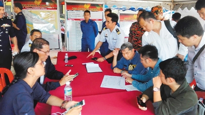 | 3月21日,一艘中国挖沙船在马来西亚附近海域倾覆。图为中国驻马来西亚大使馆人员在搜救现场与马方官员交流。(照片由外交部领保中心提供) |