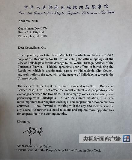 目前,这份书面道歉决议已经正式呈交中国驻纽约总领事章启月,得到了中方的书面回复,并于当地时间4月5日转呈陕西省文物交流中心。(央视记者 王萌 王风华)