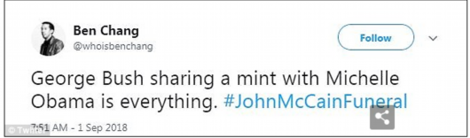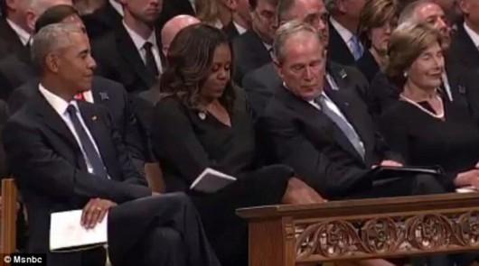 原标题:小布什在麦凯恩追悼会上给米歇尔传糖 美国网友被暖到了