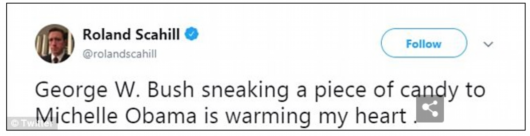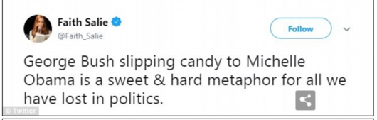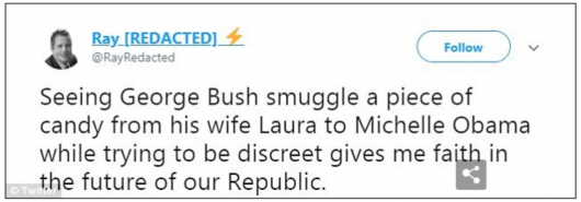 “看到小布什从妻子手中接过糖果给米歇尔,同时又试图保持谨慎,让我对共和党的未来充满希望。”