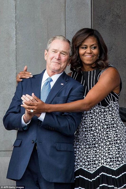 米歇尔在美国非裔美国历史文化博物馆的落成典礼上拥抱小布什